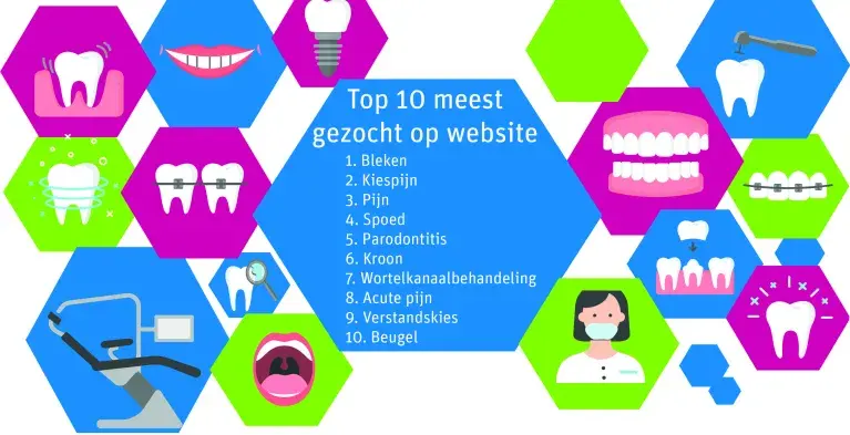 De pagina’s over kosten en vergoedingen van tandheelkundige behandelingen worden het meest bezocht. Maar ook die over kiespijn, kaakklachten en parodontitis. Bleken, pijn en spoed zijn de meest gezochte onderwerpen op de website. Maar ook zoeken patiënten veel informatie op de trefwoorden parodontitis, kroon, wortelkanaalbehandeling, verstandskies en beugel.
